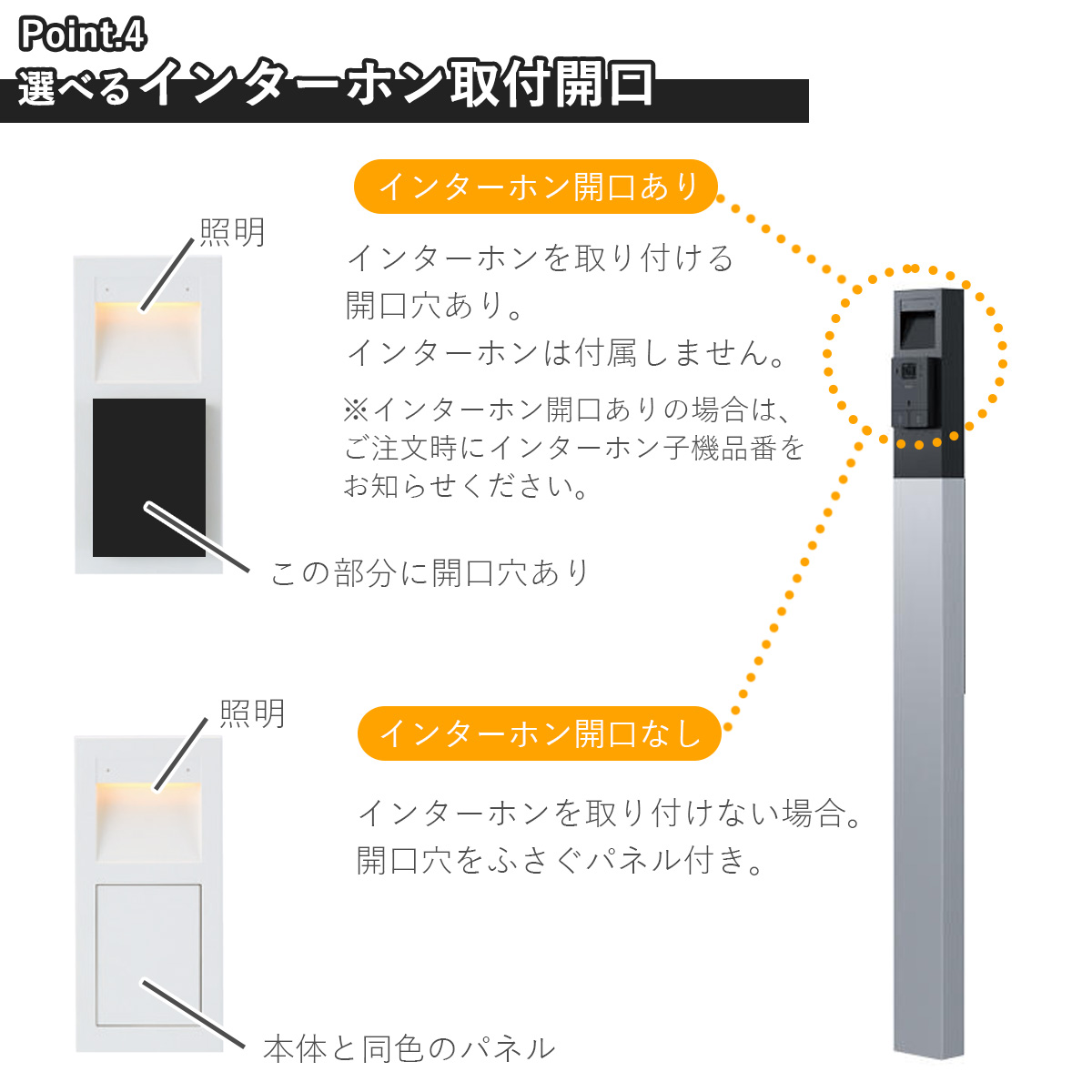 素材(門柱):支柱/アルミニウム(アルマイト処理)、インターホンボックス/ASA樹脂