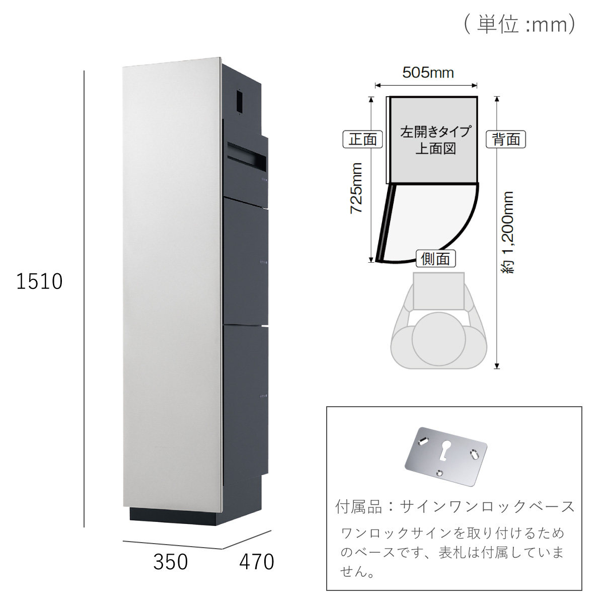 有効内寸:郵便ポスト/W345×H207×D295mm、宅配ボックス100/W345×H360×D308mm(3辺の合計が100cmまで、重量20kgまで)、宅配ボックス110/W345×H470×D308mm(3辺の合計が110cmまで、重量20kgまで)