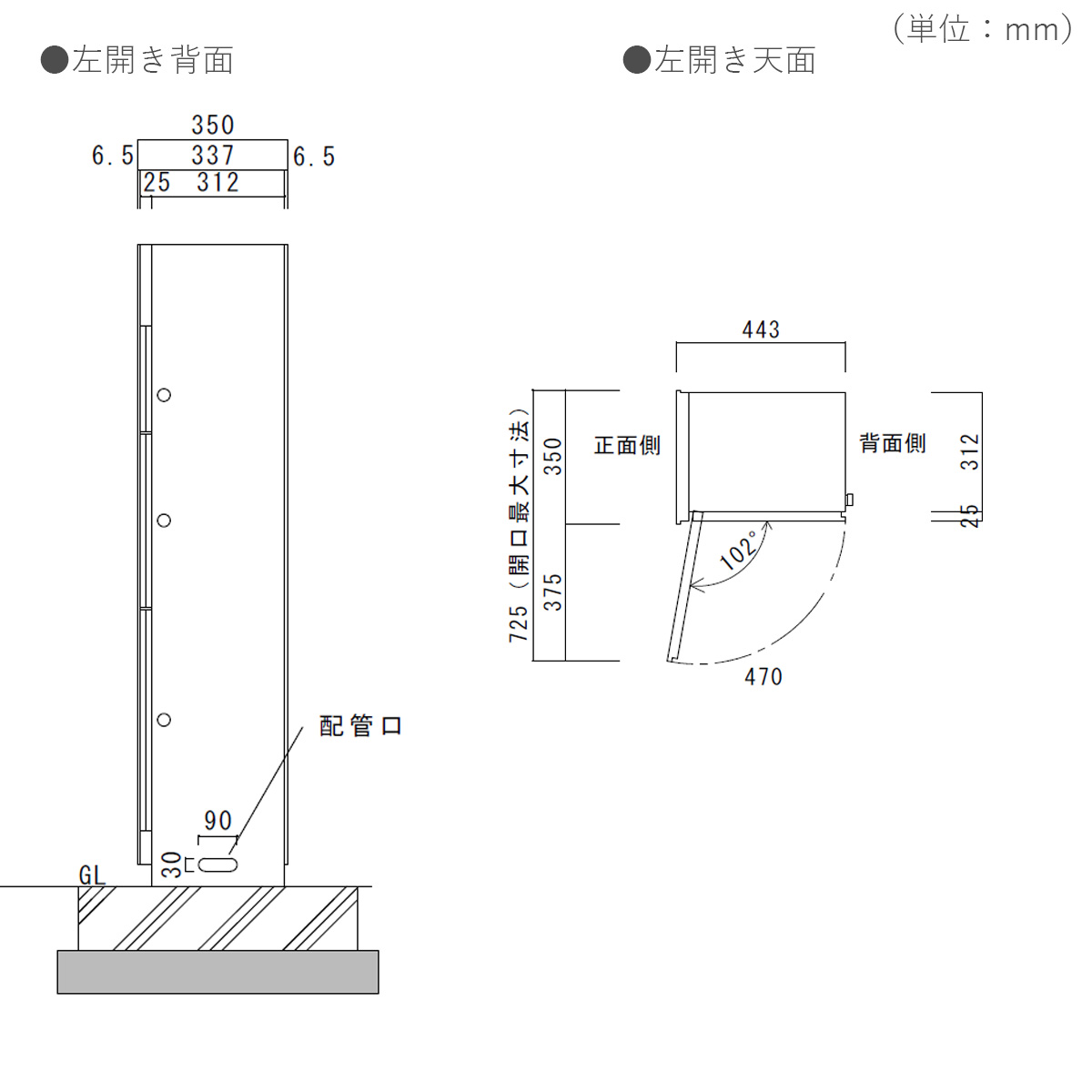 有効内寸:郵便ポスト/W345×H207×D295mm、宅配ボックス100/W345×H360×D308mm(3辺の合計が100cmまで、重量20kgまで)、宅配ボックス110/W345×H470×D308mm(3辺の合計が110cmまで、重量20kgまで)