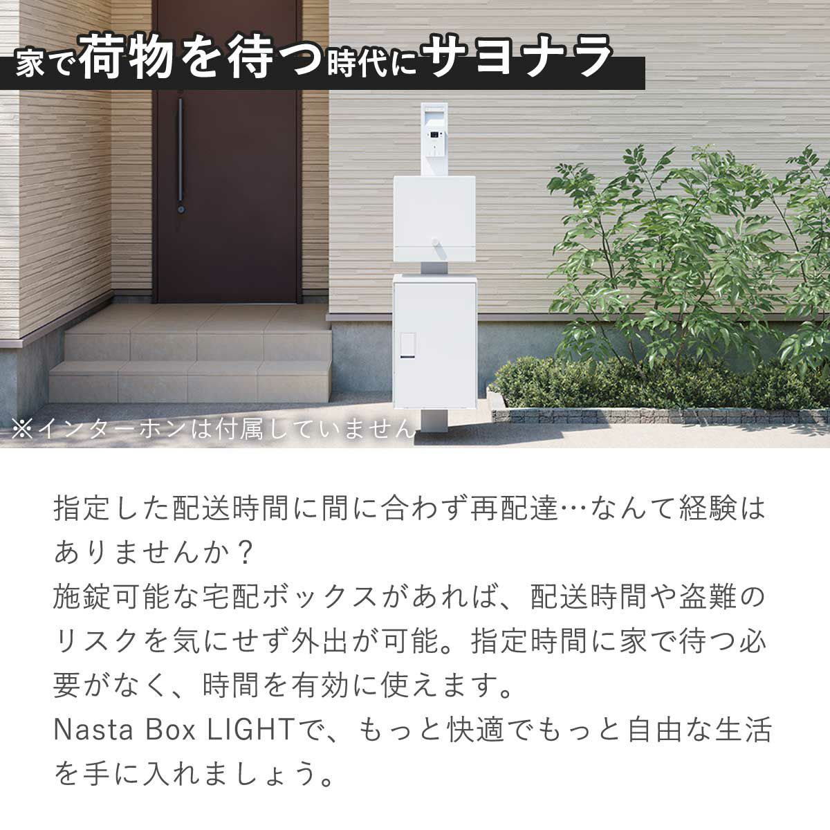 他の画像を見る 門柱 シンプル 照明 門灯 白 宅配ポスト 何度も受取 複数受取 複数投函 ポスト一体 盗難防止 ネコポス レターパック 大型郵便 A4 投函 置配 再配達 戸建て 一戸建て 「ナスタボックス +ポスト Lサイズ 門柱 ユニット [ ホワイト ]」 機能門柱 販売価格 ¥ 111,650 税込 〜 販売価格 ¥ 税込 在庫切れ 詳細を見る お気に入りに登録する (0)