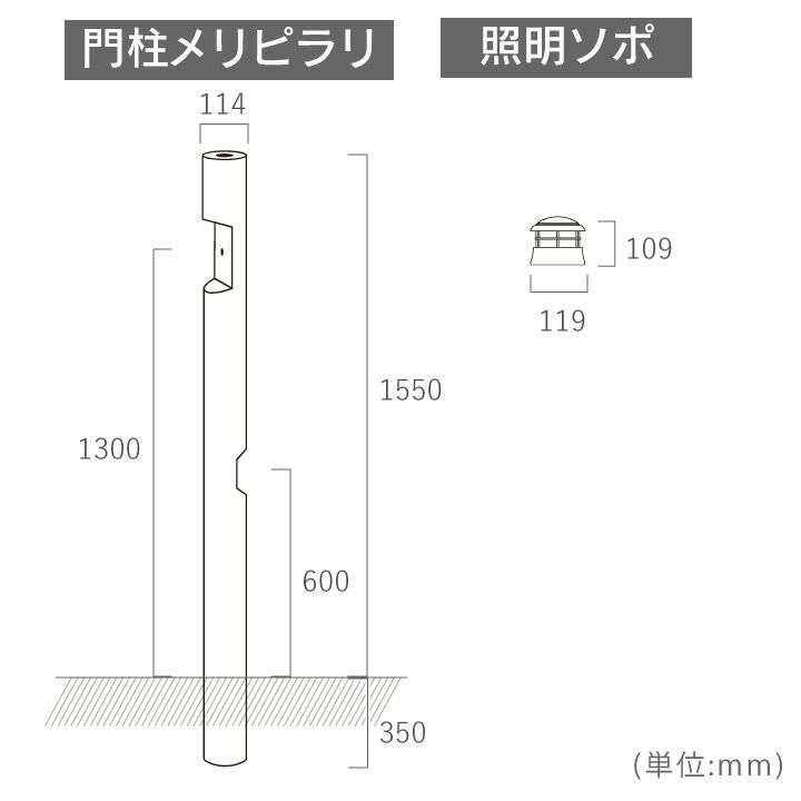サイズ:門柱/直径114×H1900(埋設部350含む)mm、照明/直径119×H109mm
