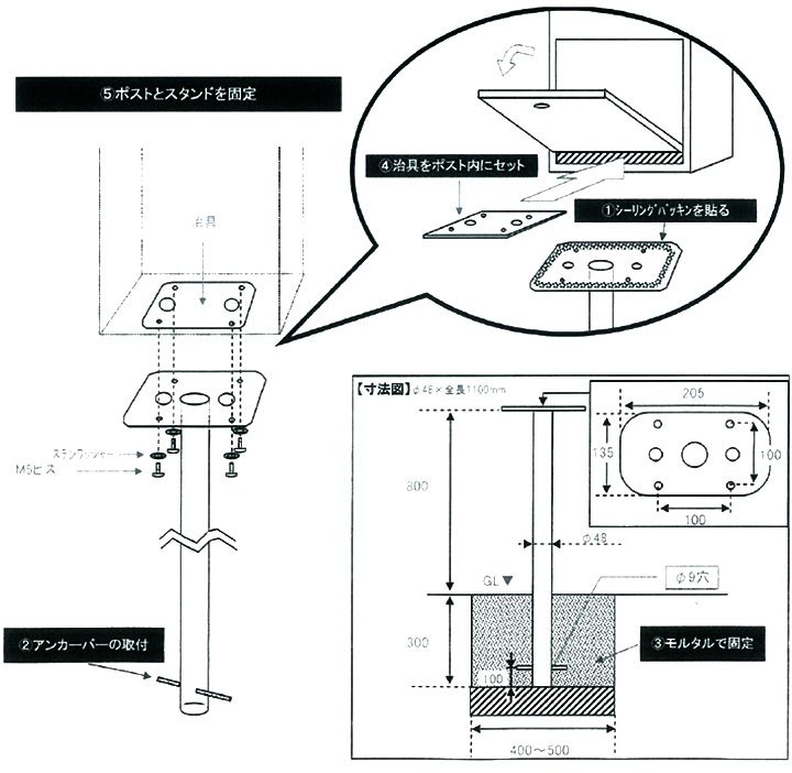 サイズ:直径48.6×H1100 mm 重量:約3 kg 素材:ステンレス(焼き付け塗装) 設置方法:コンクリート(モルタル)固定 発送までの目安:約5営業日(在庫がある場合)