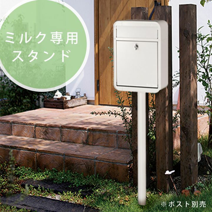 この1本足のスタンドなら、足元すっきり。カントリー調のかわいい郵便ポスト「ミルク」専用。前出しタイプ、後ろ出しタイプで使用できます。