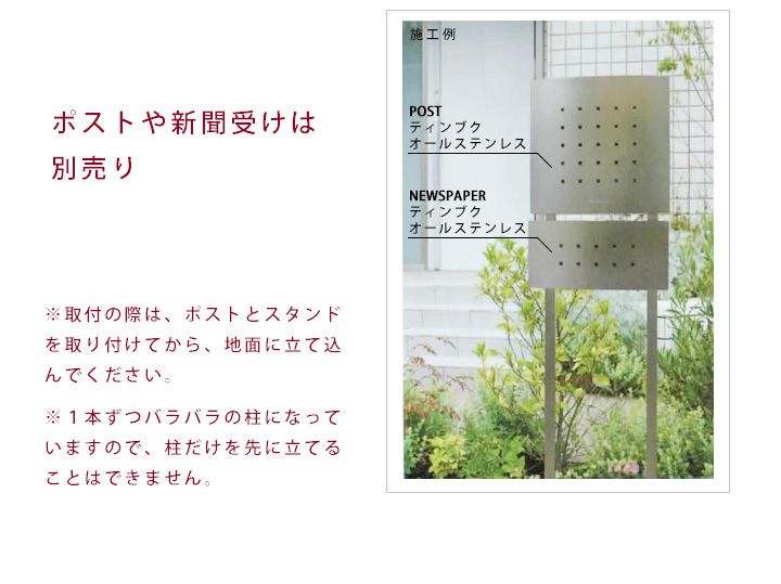 オープン外構で壁面のない家やアクセントとしてポストは独立建てしたい場合に便利な専用スタンドです。すっきりした足元を目指しましょう。スタンドの足元周りにお花の鉢を置いたり花壇にしても良いですよ。