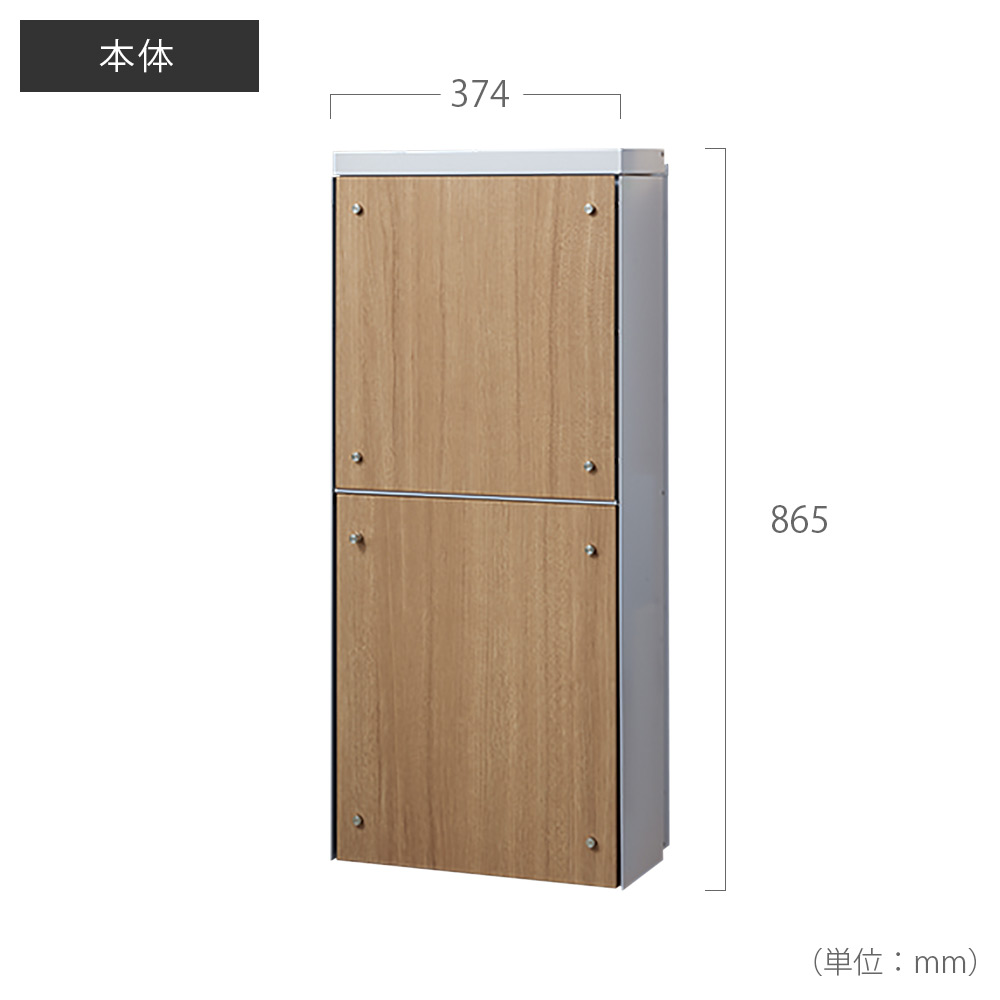 サイズ:本体/W374×H865×D158mm+α(壁面埋込部分)、ポスト投函口サイズ:270×60mm、屋内扉/W384×H894×D55mm