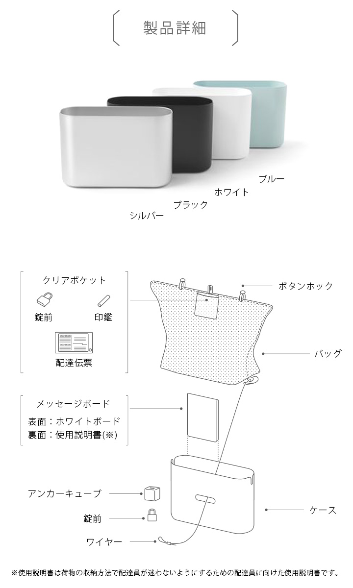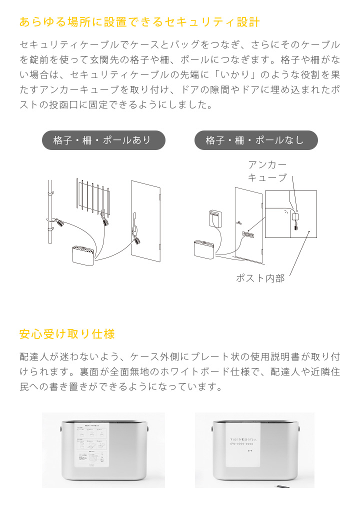 配達人が迷わないよう、ケース外側にプレート状の使用説明書が取り付けられ、