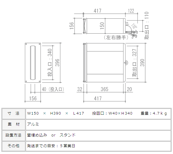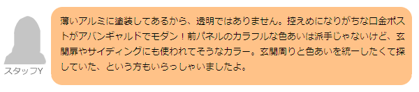 今までにない可愛いカラーなのが注目の口金式郵便ポストです。 玄関扉や屋根とのコーディネートも楽しいカラーが揃いました。 口金とは、壁の表には投函口だけ、壁後ろの敷地内から取り出す便利な郵便受け箱です。団地や住宅地で今までも一般的に使われている郵便ポストの種類ですので、使い慣れた形にも、デザインセンスをプラス。 スリムな縦型は、門柱の中で邪魔になりにくく、なにより見た目がスッキリしています。 アルミ形材は門扉やフェンスにも使われている素材です。 取り出し口はダイヤル錠になっているので、長期外出時は鍵をかけられるので、便利。 面白いのは、 取り出し口の扉を自分で右開きにも左開きにも変更できること! 取り付け場所に合わせて、後から変更してくださいね。 (標準は、右開き(右にダイヤル錠)でお届けします。)