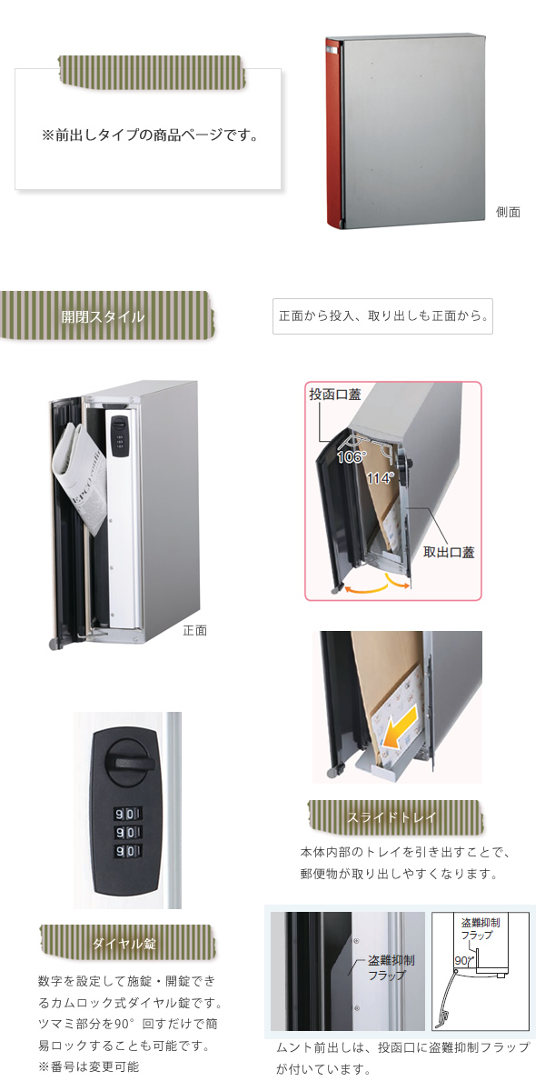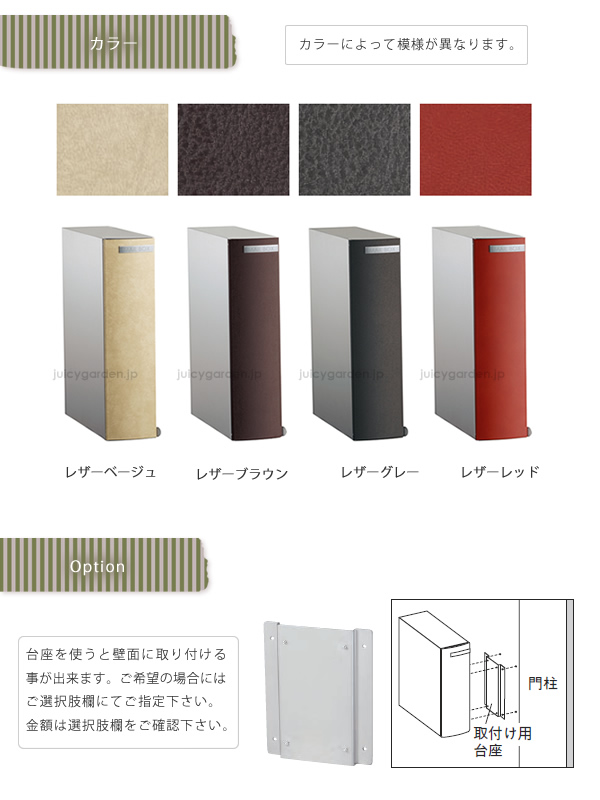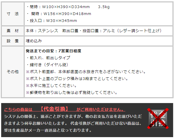 前から取り出すタイプの埋め込みポスト。コンパクトなサイズは、分譲住宅などの統一したデザインにも最適です。 ・埋め込みタイプ。 ・前入れ前出し。 ・縦型。 ・鍵仕様:ダイヤル錠付き。数字を設定して施錠・解錠出来るカムロック式ダイヤル錠。つまみ部分を90°回すだけで簡易ロックも可能です。 ・スライドトレイ付き。トレイを引き出すことで、郵便物が取出しやすくなります。 ・盗難抑制フラップ付き。 ・カラーは4色から選べます。カラーによってレザーの模様が異なります。選択肢欄にてご指定下さい。 レザーベージュ/レザーブラウン/レザーグレー/レザーレッド ・壁面取付け用の台座オプションあり。ご希望の方は選択肢欄にてご指定下さい。 ※別途追加料金が必要です。追加料金は選択肢欄にてご確認下さい。 ※自動返信メールには追加料金は加算されておりません。ご注文確認後、オプション料金を加算し、メールにて合計金額をご案内させていただきます。 ※郵便物を取り出した後、必ずロックしてください。郵便物が過度に多い場合や重量物の場合に取出口蓋が開いてしまう場合があります。 ※ポスト上面のブロック積みは3段までとしてください。 ※こちらの商品は配送時間帯指定を承る事が出来ません。