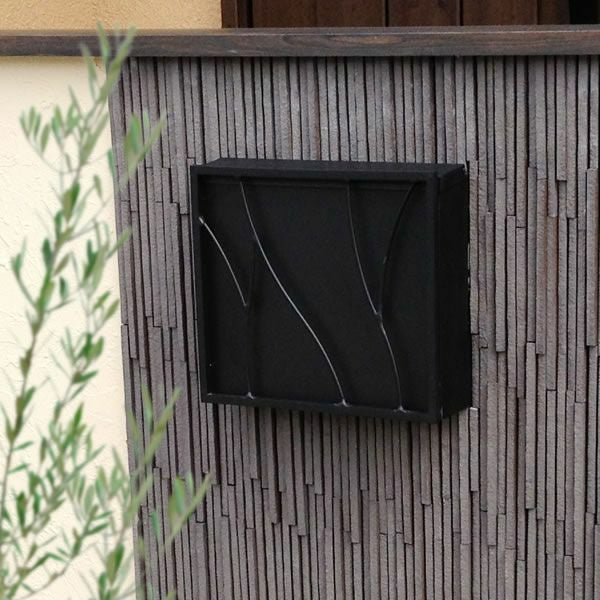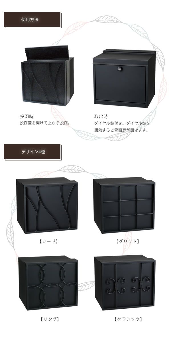 一見シンプルなブラックを貴重とした郵便受けですが、近づくほどにロートアイアン風の飾りが独特の存在感を放ち、上品さを兼ね備えたモダンなポストです。 クラシカルな雰囲気は和風にも似合い、幅広いテイストに合わせてご使用いただけます。 ・上入れ後ろ出し ・ダイヤル錠付き ・デザインは4種類の中からご選択いただけます。 シード/グリッド/リング/クラシック ※埋め込みポストのご注文ページです。