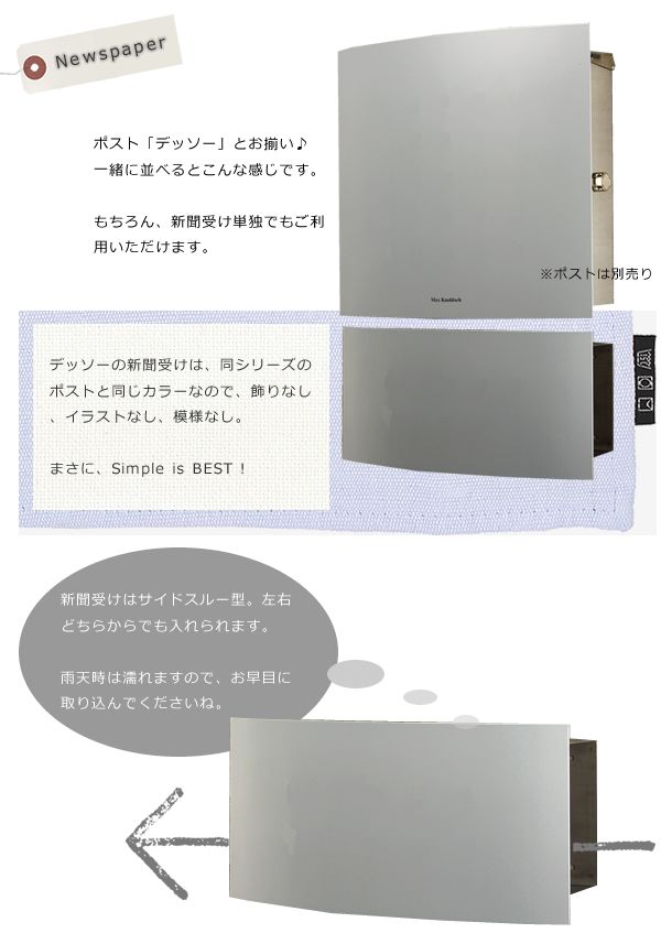 読みにくいですが、「Max Knobloch」と書いて【マックスノブロック】。 日本のデザインポスト発展の先駆けとなったと言っても過言ではないドイツのメーカーです。 ドイツ製って聞けば納得のデザイン。ドイツって車でもそうだけど工業デザインが冴えてます。 数多くあるマックスノブロック社のデザインポストシリーズに、お揃いの新聞受けもラインナップしています。ポストと独立して取付ますので、もちろん新聞受け単体でもご利用可能です。2本ラウンドポールのスタンドにも取付ていただけます。 新聞受けは・・・ ・左右どちらからでも出し入れ可能なサイドスルー型 ・新聞は丸めて2日分は入りそう 左右が開いていますので、雨天時には濡れます。新聞・郵便物を早めに取り込んでください。 ※シングルポールには取付できません。 ※内部はヘアライン加工をしていないため、傷があります。 ※ステンレスは絶対錆びない金属ではありませんので、末永いご使用のためには、日常的なお手入れをお願い致します。 マックスノブロック社 郵便ポスト Bonnボン Timbuktuティンブク Timbuktuティンブクホワイト TimbuktuALLステンレス Cherbourgシェルブール Kyotoキョウト Vegas-4ベガス Vegas-4名入れ Casablancaカサブランカ Vegasベガス 交換用鍵シリンダー 専用スクエアスタンド