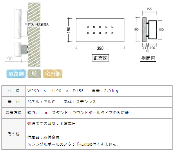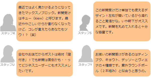 読みにくいですが、「Max Knobloch」と書いて【マックスノブロック】。 日本のデザインポスト発展の先駆けとなったと言っても過言ではないドイツのメーカーです。 ドイツ製って聞けば納得のデザイン。ドイツって車でもそうだけど工業デザインが冴えてます。 数多くあるマックスノブロック社のデザインポストシリーズに、お揃いの新聞受けもラインナップしています。ポストと独立して取付ますので、もちろん新聞受け単体でもご利用可能です。2本ラウンドポールのスタンドにも取付ていただけます。 新聞受けは・・・ ・パネルのカラーはホワイト、本隊BOXはステンレス8色 ・左右どちらからでも出し入れ可能なサイドスルー型 ・新聞は丸めて2日分は入りそう 左右が開いていますので、雨天時には濡れます。新聞・郵便物を早めに取り込んでください。 ※シングルポールには取付できません。 ※内部はヘアライン加工をしていないため、傷があります。 ※ステンレスは絶対錆びない金属ではありませんので、末永いご使用のためには、日常的なお手入れをお願い致します。 マックスノブロック社 郵便ポスト Bonnボン Timbuktuティンブク Timbuktuティンブクホワイト TimbuktuALLステンレス Cherbourgシェルブール Kyotoキョウト Vegas-4ベガス Vegas-4名入れ Casablancaカサブランカ Vegasベガス 交換用鍵シリンダー 専用スクエアスタンド