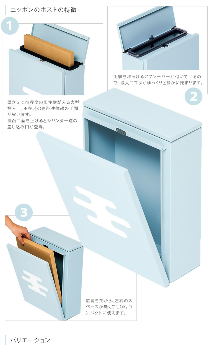 また、前に倒れる取り出し扉はコンパクトで、小さな門柱やスペースの限られる玄関ポーチにも設置しやすいのが特徴です。
