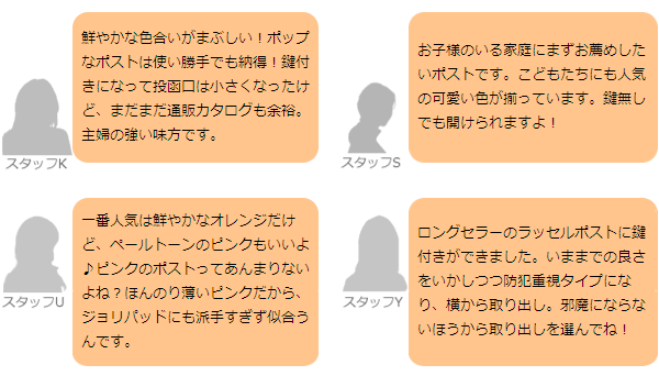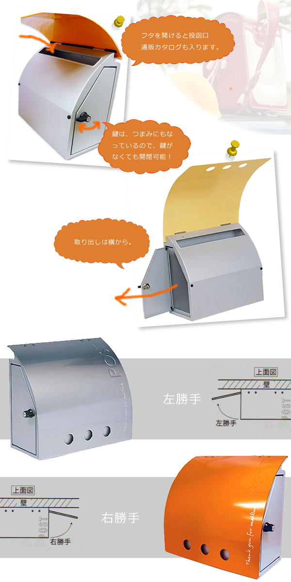 鍵有りバージョンは上から投函して、横から取り出すタイプです。鍵付きですが、鍵をかけなくても開閉はできます。旅行や出張のときだけ鍵をかけることもOK。プライバシーの確保もバッチリ。