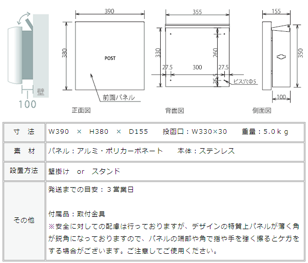※ポスト内部はヘアライン加工をしていないため、傷があります。 ※ステンレスは絶対錆びない金属ではありませんので、末永いご使用のためには、日常的なお手入れをお願い致します。