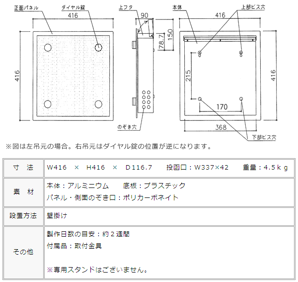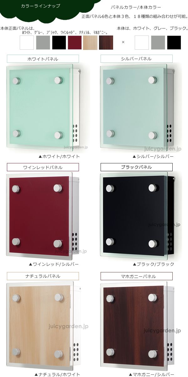 「名入れ」がとても似合うポスト。 大きな前パネルに名入れオーダーすることにより、表札も兼用になり、エクステリアも引き締まります。名前はステンレスにお入れします。ステンレスはポストに貼らずに同梱でお届けします。裏面の両面テープを剥がして、ポストに貼り付けてください。 透明感のある、洗練されたスクエアフォルムの郵便ポスト登場! スタイリッシュでクールな美しいフォルムは機能性も備えて、シンプルモダンな雰囲気。木目パネルも加わって、ますます幅広いエクステリアで楽しめるようになりました。 前面パネルについている丸い4つの装飾の一つがダイヤル錠になっているこだわりのデザイン。ダイヤル錠をポストデザインに揃えてわざわざ作ってあるってほとんどないんですよ。デザインのこだわりを感じる部分です。素材の特性上、軽すぎるのが玉にキズ・・・? 扉も片手で楽々開閉できます。正面からポストとわかないデザインは、透けるパネルのスクエアと大きめ丸い化粧ビスが可愛いです。 また、扉勝手が選べるのが嬉しい!!右開きでも左開きでも、設置場所に合わせてお選びいただけます。 文句なしだね~がスタッフの感想。 前パネルはよくガラスに間違われますが、ポリカーボネイト製です。そのため、結構軽いです。もちろん、薄出のポストながらA4の入る封筒角2や新聞も入れることができます。上入れ前出しで投函しやすく取り出しやすいデザインなんです。 人気者ゆえに、カラーも増えてきました。正面パネル6色×本体3色の18種類の組み合わせから選べます。シルバー、ホワイト、ブラックは、クリスタルグリーンのポリカを使用しているので、爽やかな印象。ワインレッド、ナチュラル、マホガニーはクリアのポリカでクッキリしたカラーを楽しめます。 お好きな組み合わせを見つけてくださいね。 ラインや飾り枠のカラーは、見本通りとなります。