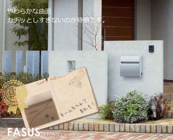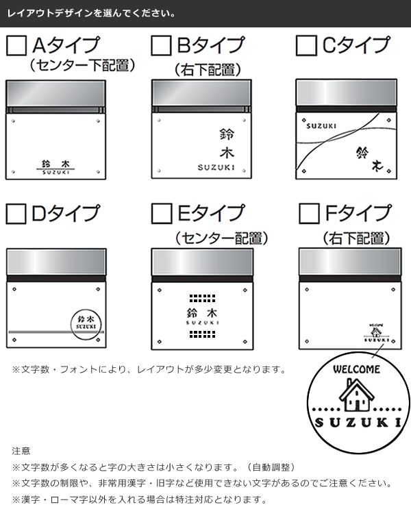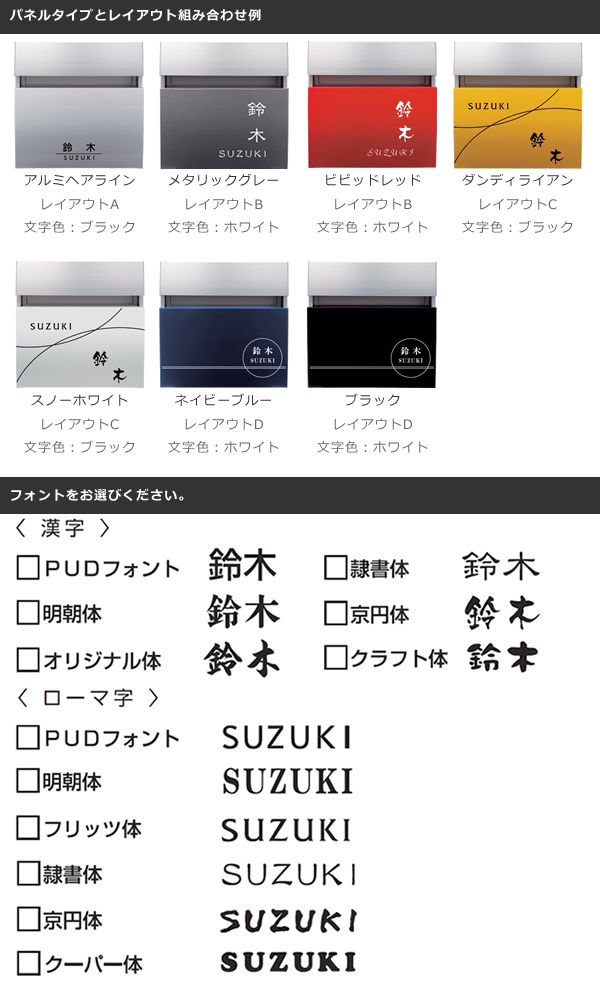 郵便ポストに名前を入れてネーム入りポストで表札兼用にしませんか? パナソニック電工製で人気の「FASUS FF ラウンドタイプ」にこのオプションを追加することで名入れオーダー承ります。 表札を設置するスペースがない場合や、ポストと兼用することにより玄関周りのデザインもすっきり収めることができます。シールではなく、パネルに直接ネームを印字します。 まず、ポストを選んでカートに入れた後、フォントやレイアウトをじっくりお選びくださいね。 ポストはフェイサス ラウンドタイプよりお選びください。 ポストは別売りですので、ポストは忘れず一緒にご注文ください。 ※版下作成はございませんので、ご注文時にお間違えのないよう十分ご注意くださいませ。