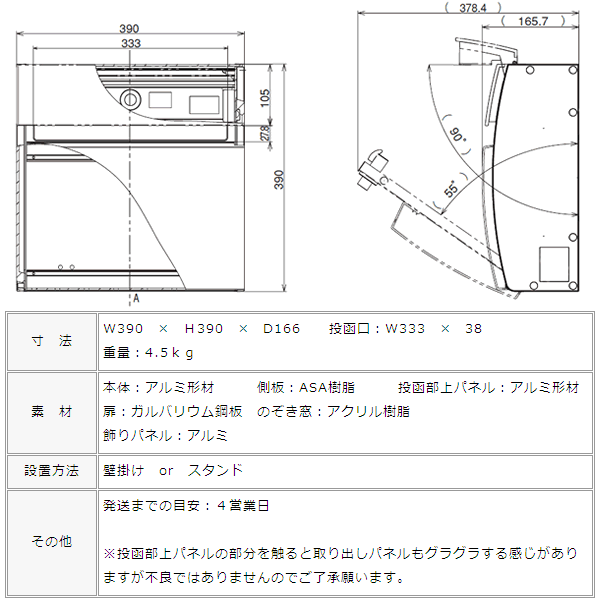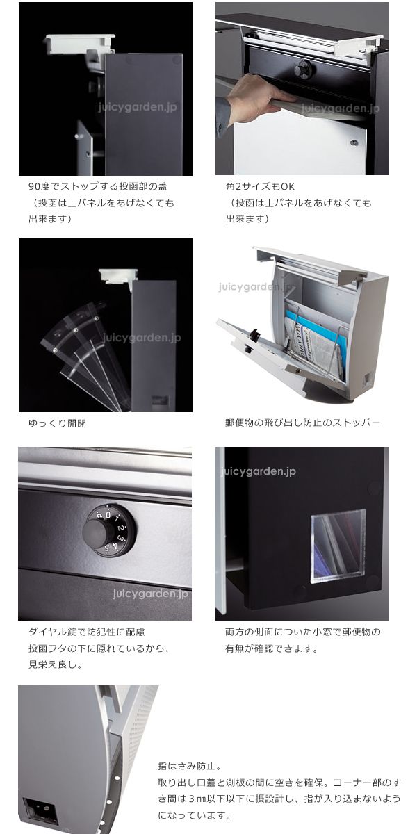 なだらかな曲線がやさしい印象を与えるラウンドデザインを採用。ゆるやかに弧を描くアルミ製のパネルが、個性的で上質なエントランスを演出します。モダンな暮らしに映える8色をラインナップしています。 ・一端開けると蓋が停止して止まる「天蓋保持機能」を採用し、降雨時に傘をさしていても片手で郵便物の取り出しができます。 ・「ゆっくり蓋・バタンレス機構」で取り出し口の蓋がゆっくり開閉。音が静かで、急な開閉による指つめ防止にも配慮。 ・雨水がポスト内に浸入しても外部に抜けて郵便物が濡れにくい排水構造になっています。 ・ 投函された郵便物の倒れを防ぎ、つかみやすくする「倒れ防止アーム」や、ダイヤル錠付で防犯性にも配慮。 ・ 郵便物が入っているかどうかを外側から確認できる小窓ももちろんあります。 ※投函部上パネルの部分を触ると下の取り出しパネルもグラグラする感じがありますが不良ではありませんのでご了承願います。 ※投函口や側面は樹脂製です。