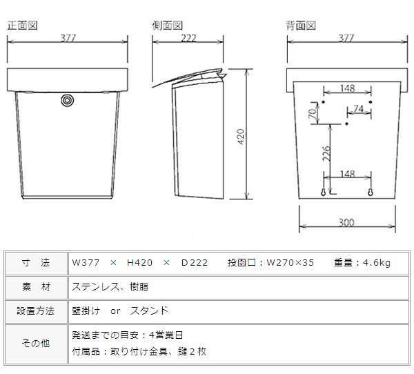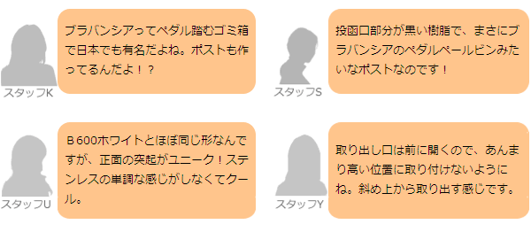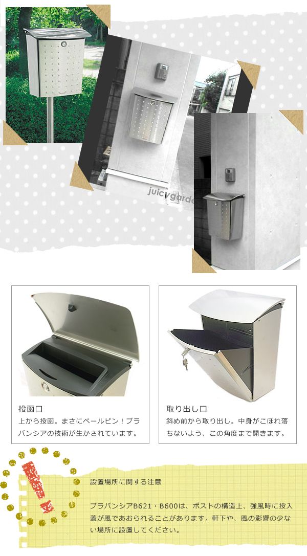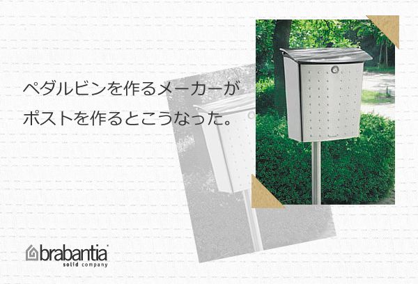 ブラバンシアの郵便ポストB621はまさにペールビンの作りを生かしたポストです。 ブラバンシアのペールビンに代表される家庭用品製作で培ったノウハウで作られています。無駄なく郵便物を入れやすい投函口、郵便物がこぼれ落ちない取り出し口になっているのです。 B621はステンレス(前面に凹凸のアクセントあり)、B600は艶ありホワイトとなっています。こちらはB621ステンレスのページです。 上入れ前出し、鍵付き。鍵は標準で2枚ついてきます。セキュリティ重視なので、ポストが届いたら、鍵はバラバラに保管してくださいね。壁掛けタイプもしくは別売りオプションでスタンドに立てることも可能です。 ブラバンシア(brabantia)社は、世界で定評のあるオランダの高級家庭用品メーカー社です。誰もが一度は見たことのある、ペダルを踏んで開けるゴミ箱(ペダルペールビン)などを作ってます。