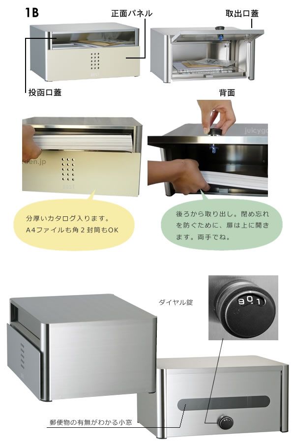 だから、前入れ後ろ出しです。厚みのある通販カタログや新聞も入りやすい奥行があり、後ろからはダイヤル錠でガバっと取り出し。