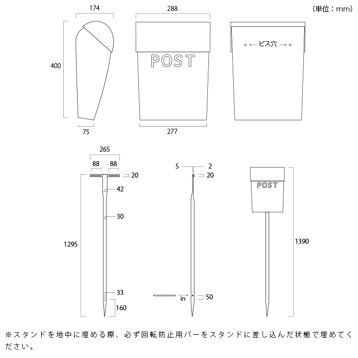 回転防止用のバーが付属し、ポストの向きが変わらないよう配慮がなされています。