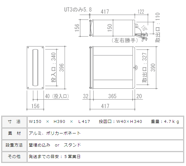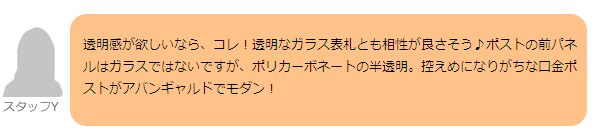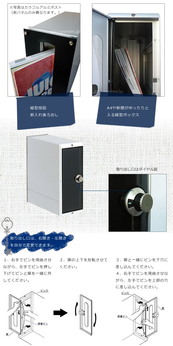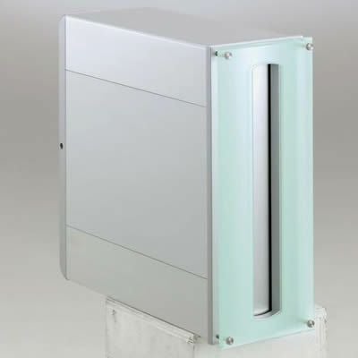 涼しげな半透明のポリカが優しい印象の口金式ポストです。 ガラスとは違うけど、透け感があるのでガラス表札と合わせたい方にもお薦めです。 口金とは、壁の表には投函口だけ、壁後ろの敷地内から取り出す便利な郵便受け箱です。団地や住宅地で今までも一般的に使われている郵便ポストの種類ですので、使い慣れた形にも、デザインセンスをプラス。 スリムな縦型は、門柱の中で邪魔になりにくく、なにより見た目がスッキリしています。 アルミ形材は門扉やフェンスにも使われている素材です。 取り出し口はダイヤル錠になっているので、長期外出時は鍵をかけられるので、便利。 面白いのは、 取り出し口の扉を自分で右開きにも左開きにも変更できること! 取り付け場所に合わせて、後から変更してくださいね。 (標準は、右開き(右にダイヤル錠)でお届けします。)