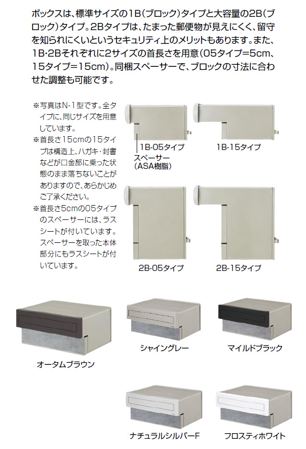 シンプルで実用的な汎用ポスト。 本体ボックスのサイズは、コンクリートブロックに合わせて浅めの1B(ブロック1個分の深さ)と、2B(ブロック2個分の深さ)があります。 ※こちらは1Bタイプです ※壁やブロックの厚さによって投函部分の奥行きサイズをお選びください