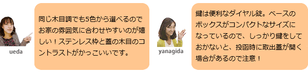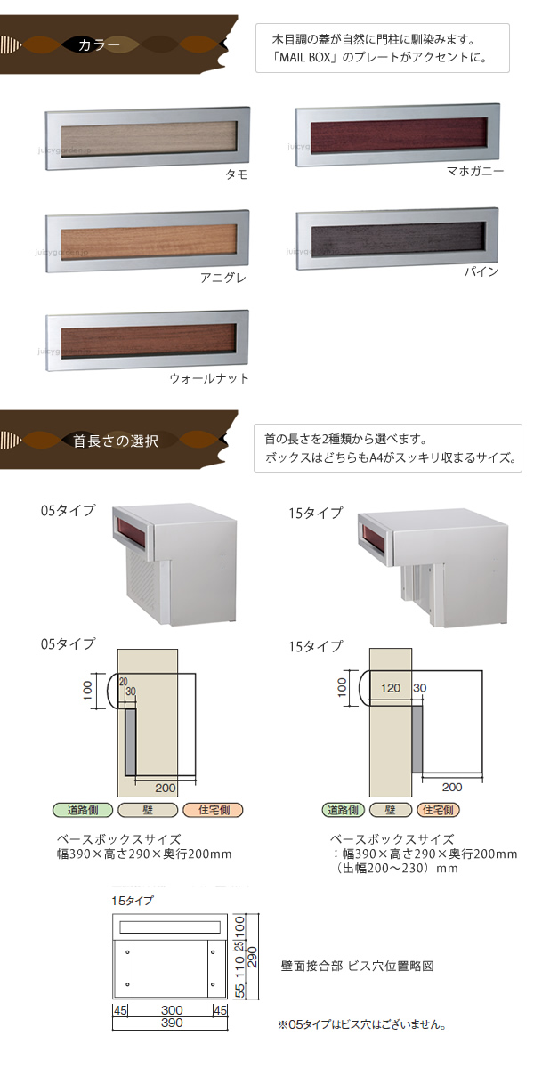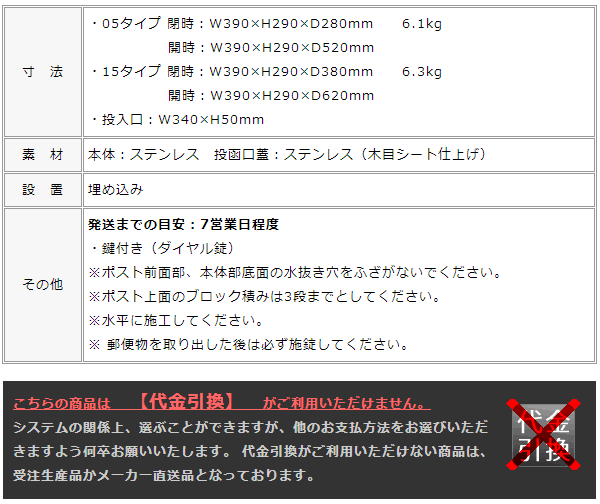 モダンなステンレスとナチュラルな木目を組み合わせたスタイリッシュな埋め込みポスト。口金しか出ないタイプの郵便受けは、門柱のデザインを邪魔せずシンプルに馴染みます。 ・埋め込みタイプ。前入れ後ろ出し。 ・鍵仕様:ダイヤル錠付き。 ・首の長さを2種類から選べます。住宅側の出幅を最小限にした05タイプと、施工性を考慮した15タイプをご用意。選択肢欄にてご指定下さい。サイズ05/サイズ15 ・カラーは5色から選べます。選択肢欄にてご指定下さい。 タモ/マホガニー/アニグレ/パイン/ウォールナット ※鍵番号の変更・指定は出来ません。 ※郵便物を取り出した後、必ず施錠してください。郵便物が過度に多い場合や重量物の場合に取出口蓋が開いてしまう場合があります。 ※ポスト上面のブロック積みは3段までとしてください。 ※メーカー直送品のため、代金引換はご利用いただけません。 ※こちらの商品は配送時間帯指定を承る事が出来ません。