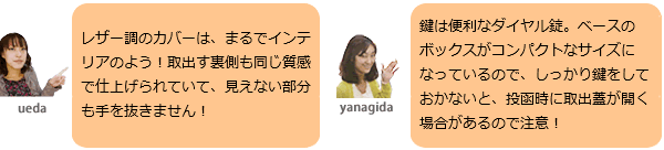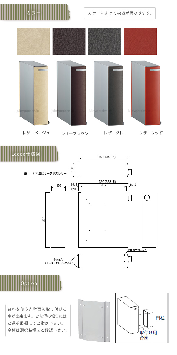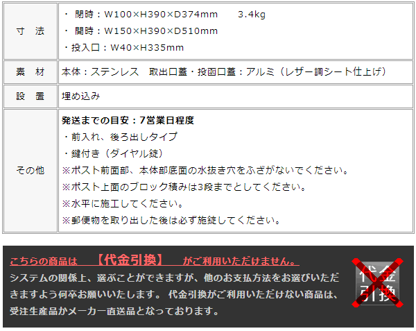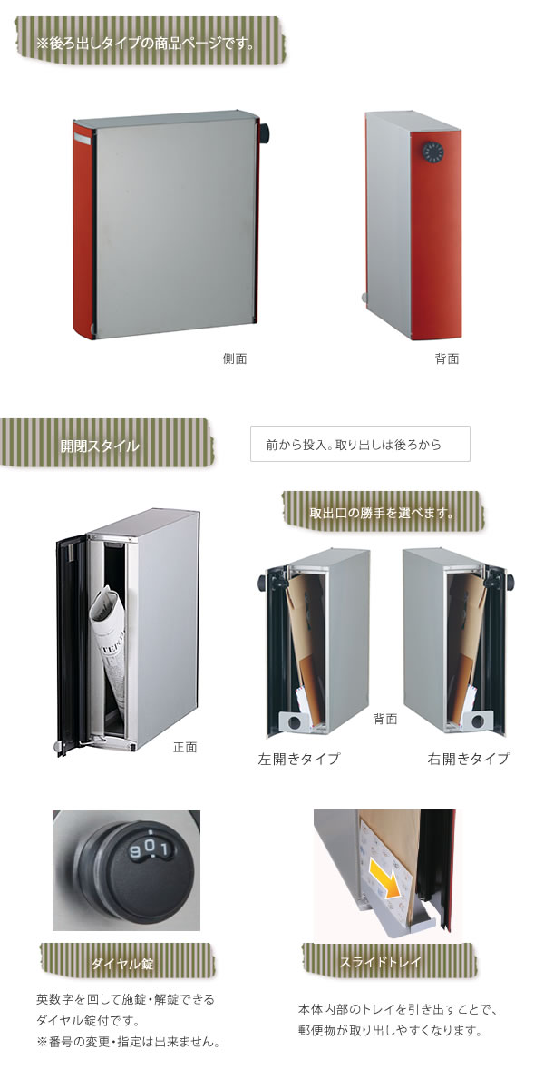レザー調のカラーが珍しく、まるでインテリアを持ち出したかのようなスタイリッシュさが魅力の埋め込みポストです。コンパクトなサイズは、分譲住宅などの統一したデザインにも最適です。 ・埋め込みタイプ。 ・前入れ後ろ出し。 ・縦型。 ・鍵仕様:ダイヤル錠付き。 ・スライドトレイ付き。トレイを引き出すことで、郵便物が取出しやすくなります。 ・カラーは4色から選べます。カラーによってレザーの模様が異なります。選択肢欄にてご指定下さい。 レザーベージュ/レザーブラウン/レザーグレー/レザーレッド ・壁面取付け用の台座オプションあり。ご希望の方は選択肢欄にてご指定下さい。 ※別途追加料金が必要です。追加料金は選択肢欄にてご確認下さい。 ※自動返信メールには追加料金は加算されておりません。ご注文確認後、オプション料金を加算し、メールにて合計金額をご案内させていただきます。 ※鍵番号の変更・指定は出来ません。 ※郵便物を取り出した後、必ず施錠してください。郵便物が過度に多い場合や重量物の場合に取出口蓋が開いてしまう場合があります。 ※ポスト上面のブロック積みは3段までとしてください。 こちらの商品は配送時間帯指定を承る事が出来ません。
