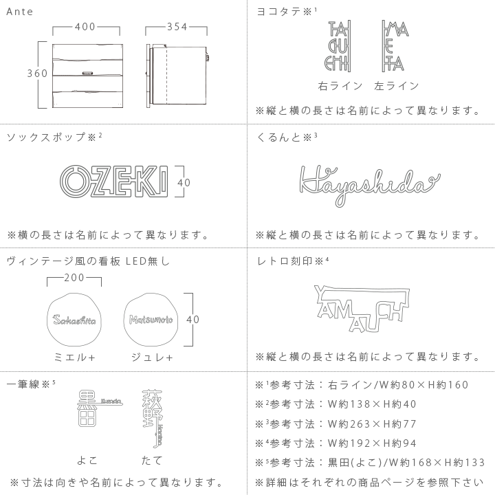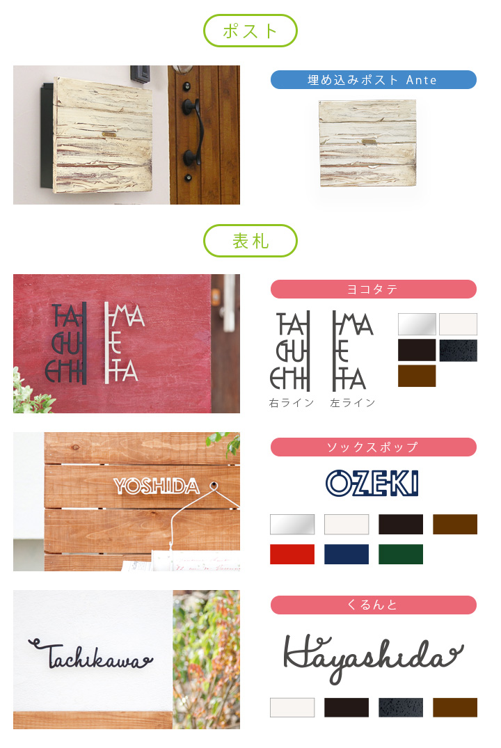 表札はポストにマッチするデザイン性の高いものをチョイスしました!中でも「ヨコタテ」「一筆線(たて)」は二世帯のお宅にもおすすめですよ~。