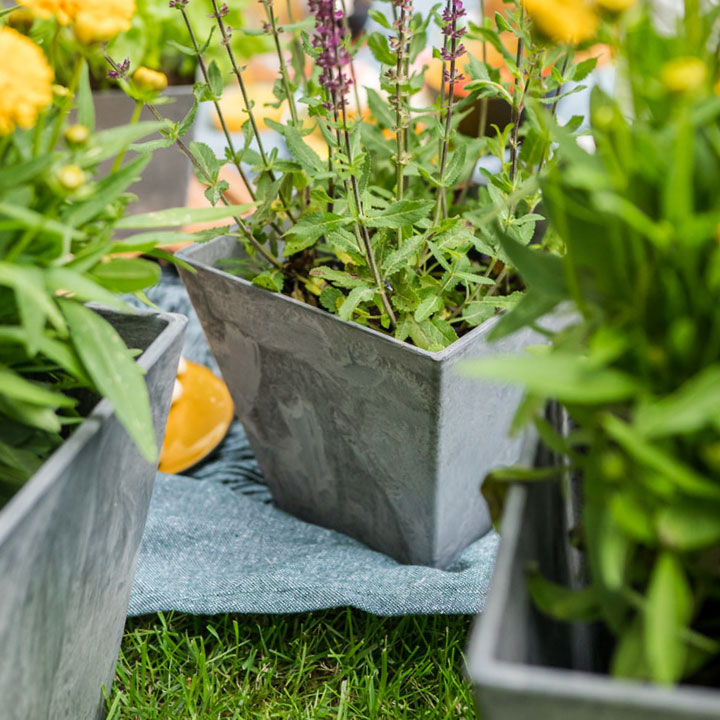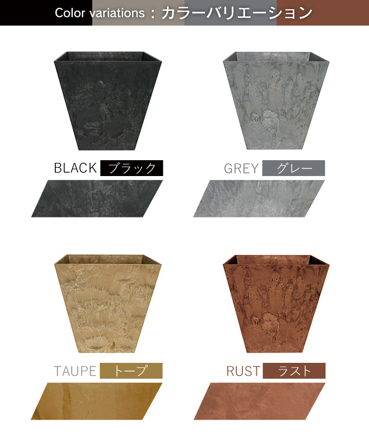 樹脂と天然石パウダーを独自の配合で製造されたプランターは石のようななめらかな質感で様々な植物とバランスよく調和します。