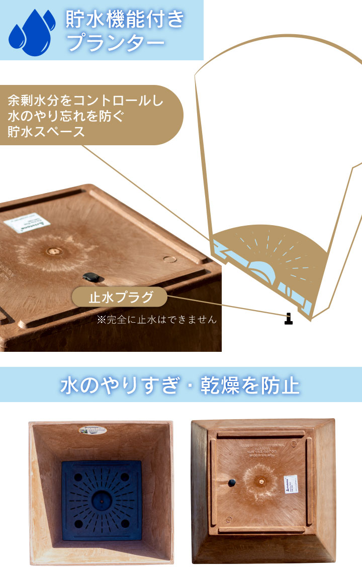 プランター底部にある貯水スペースが水やりの際に貯水し、乾燥した際には貯水スペースから植物が水分を吸い上げるので水やりの水分コントロールが簡単に。