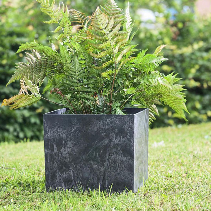 均等なスクエアな形が美しいデザインのキュービックポットは軽量ながら大容量の植木鉢です。