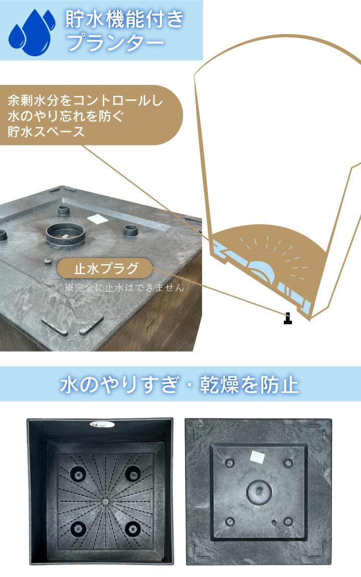 プランター底部にある貯水スペースが水やりの際に貯水し、乾燥した際には貯水スペースから植物が水分を吸い上げるので水やりの水分コントロールが簡単に。