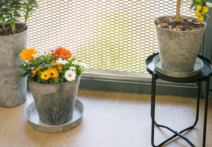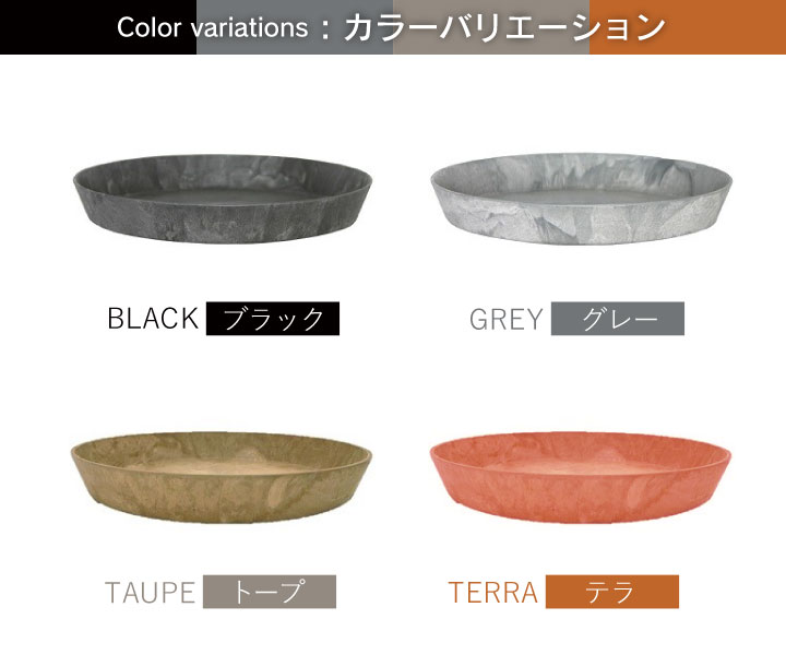 クレールラウンドソーサーは、さまざまな鉢や植物と調和するシンプルなデザインで、3種類のサイズと4種類のカラーを取り揃えています