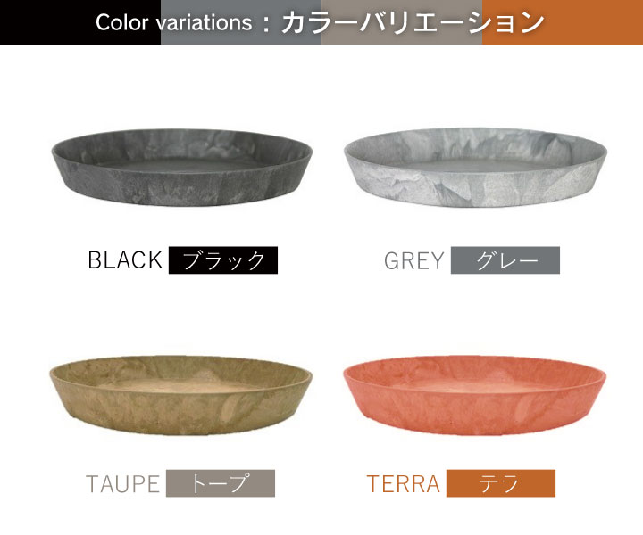 クレールラウンドソーサーは、さまざまな鉢や植物と調和するシンプルなデザインで、3種類のサイズと4種類のカラーを取り揃えています