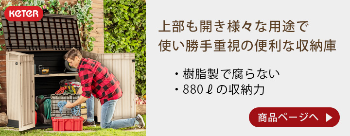 お庭で使用するガーデニング用品や遊具など、家の中よりも外で片づけたいものを収納するのに適した収納庫「ケター ストアイットアウト プライム(STORE IT OUT PRIME)」。