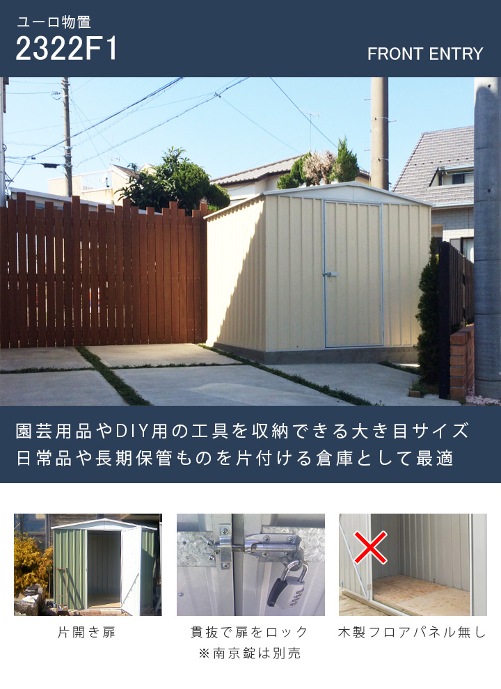 ※この物置には元々床が付属していないため、床はコンクリートで造っていただくか、木製床キットのセットをご購入いただく必要がございます。