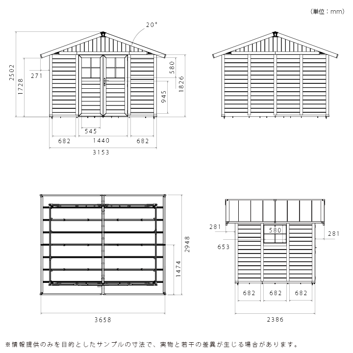 サイズ(完成時):本体/W3153×H2502×D2386mm(約4畳)、屋根/W3658×D2948mm(若干の差異がございます)