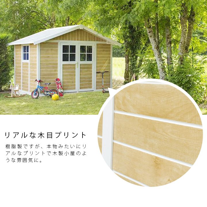 無骨なイメージが強い物置が多い中、温かみを感じる木目調の物置になっています。