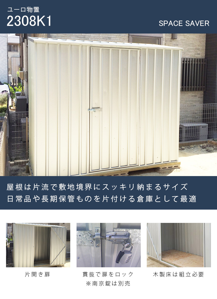 こちらは「物置本体(2308K1)」+「木製床キット」+「木製床用アンカー」のセット販売ページです。コンクリート基礎を製作いただき、コンクリートを床にされる場合には別ページからご注文下さい。