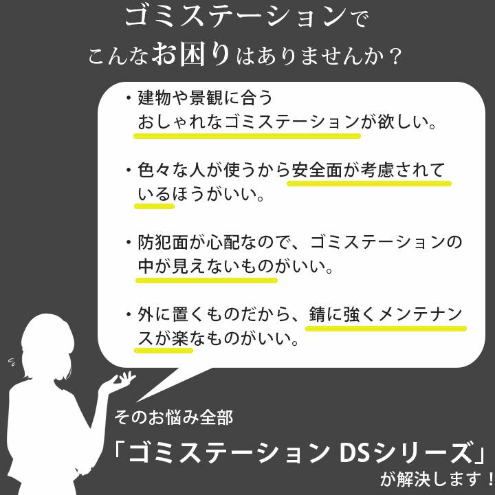 他の画像を見る ゴミ収納庫 おしゃれ カラス対策 猫対策 雨対策 外から見えない メンテナンスフリー メンテナンス楽 錆びない 掃除が楽 匂いが漏れない 匂いが付かない 匂いが残らない 町内会 自治会 中型ゴミ集積庫「ゴミステーション DS01 580L ステンレス W1200×D600×1000mm」(YHC) 当店通常価格 ¥ 396,000 販売価格 ¥ 356,400 税込 詳細を見る お気に入りに登録する (0)