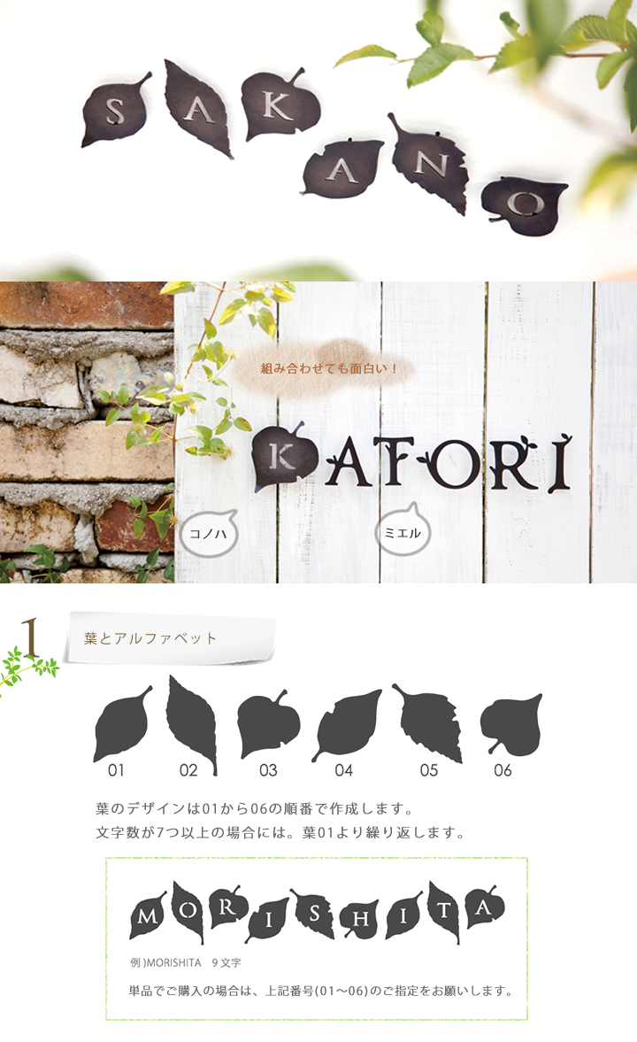 4. ひとひらの風を描く木の葉の軌跡 「おしゃれアルファベット抜き文字表札 konoha コノハ 」