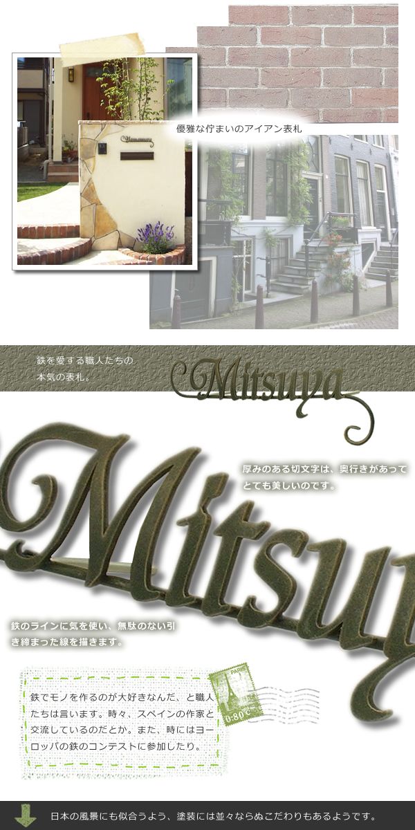 そのせいか、ヨーロッパの旅先や写真で見た門やフェンス、鉄柵、橋の欄干・・・どこかそんな雰囲気を思い起こさせます。レンガやタイル、石材など自然素材に馴染むアイアン表札です。