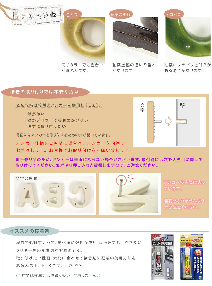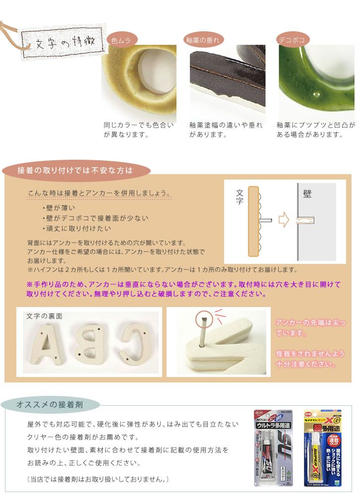 ・アンカー付属を選択された場合は、お手持ちの接着剤を使用してアンカーを文字に取り付けてお使いください。