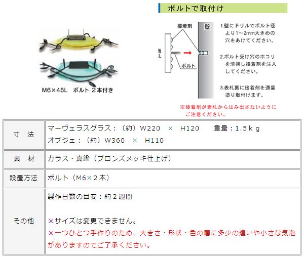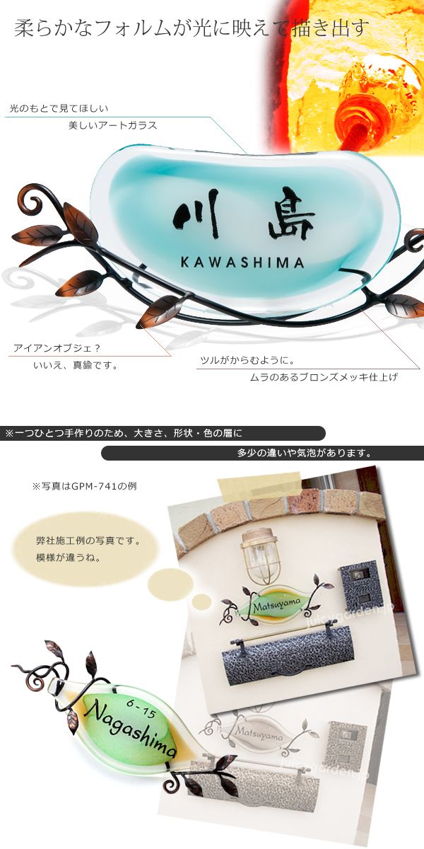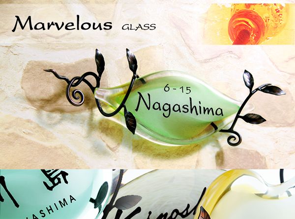 マーヴェラス = 驚嘆すべき・素晴らしい そんな名前の付いたガラスは、ぽってりと肉厚で程よい透明感と艶感が魅力。 色彩が織り成すグラデーションが綺麗です。 1400℃の高温で溶かした色ガラスを熟達した職人の技で何層にも重ね合わせて作り上げ、炎と匠の技から生み出される美しいアート表札。 「GPM-771 パステルストーリー」は川の流れのような爽やかなフレッシュブルーもしくはフレッシュグリーン系。動きを感じさせる微妙なグラデーション!ぽってりした形のマーヴェラスグラスデザインです。 美しいマーヴェラスグラス表札から、あふれ出るように優しいラインを描くオブジェも必見です。 このオブジェは、アイアンオブジェのように見えますが、実は「真鍮製」。所謂、5円玉と同じですね!そのため、鉄の赤錆は発生しません。5円玉のように緑青は出る可能性がありますが、鉄の赤錆の発生速度に比べるとかなり時間がかかると言われています。 一つひとつ手作りのため、大きさ・形状・色の層に多少の違いや小さな気泡がありますのであらかじめご了承の上、ご注文ください。