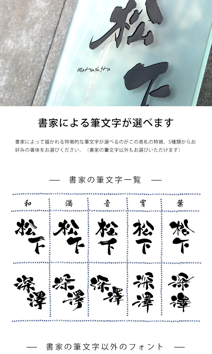 書家がその都度文字を描きますので、同じものが1つとないオンリーワンの表札となります。