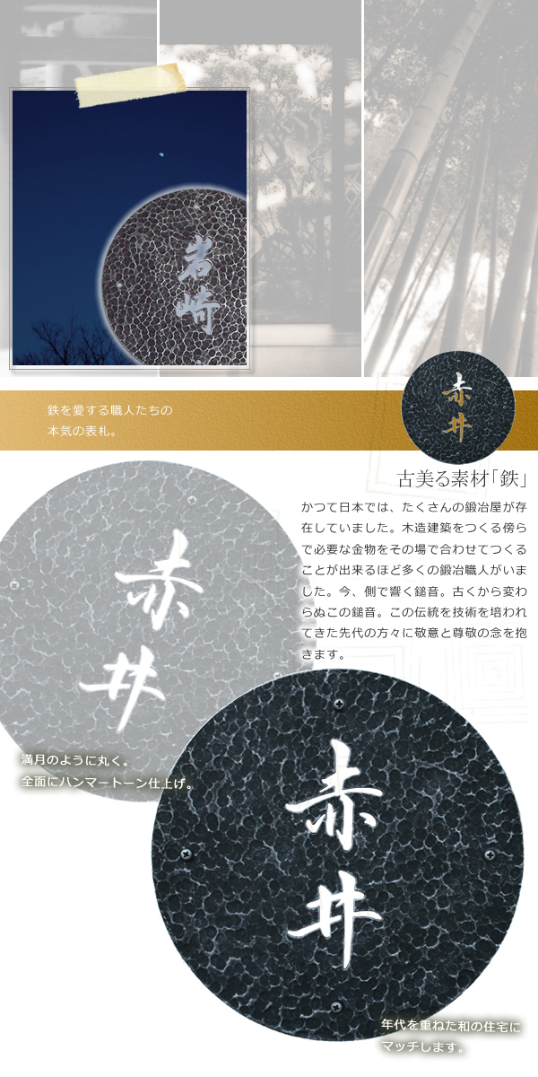 丸いです。和のアイアン表札、漢字もOK!一面に入ったハンマートーン仕上げが和のしつらい。石や瓦屋根とも相性の良い古美仕上げも必見の価値あり。