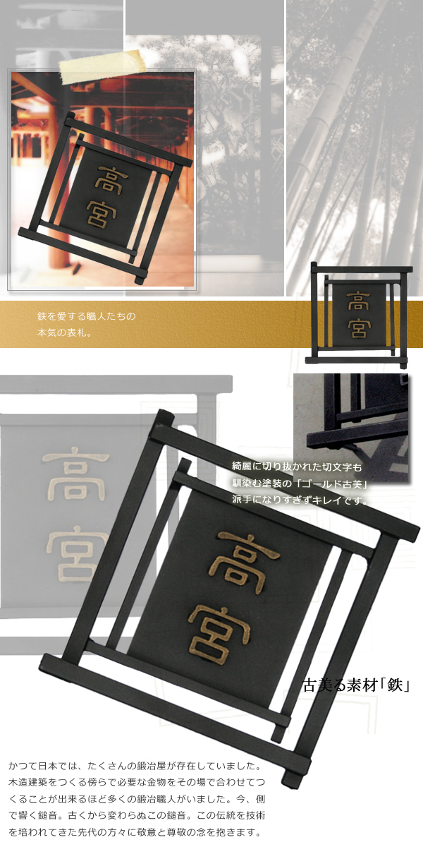 和のアイアン表札、漢字!日本の伝統デザインをイメージ。これは組み木?石や瓦屋根とも相性の良い古美仕上げも必見の価値あり。