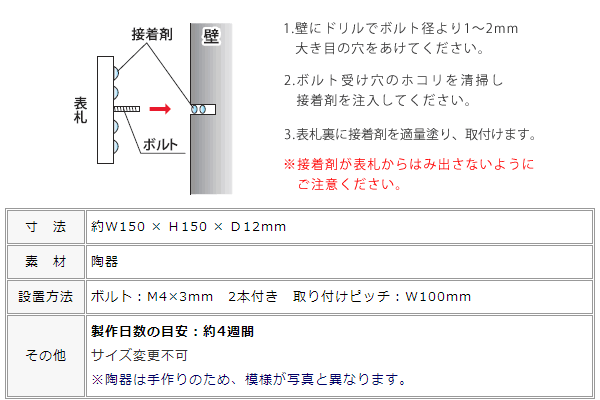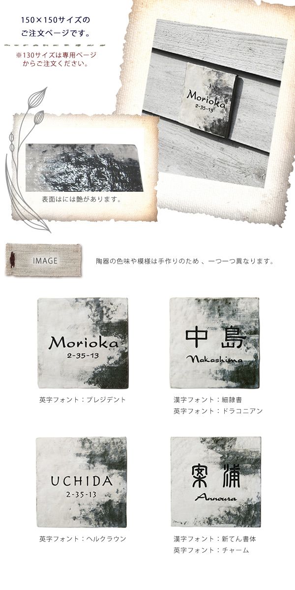 油絵のようなテイストの陶器の模様がシャビーな雰囲気を作り出す陶板の表札。 ナチュラル、レトロ、モダンと、様々な雰囲気に馴染みます。 シャビーなガーデン雑貨と相性が良く、女性目線で作られたデザイン表札なんです。 自然素材とも好相性。 ・サイズ150×150mmの商品ページです。 ・取り付けはボルトです。M4×30mm(2本)ボルトピッチW100mm ※陶器は手作りのため、一つ一つ色味や模様が異なります。 ※焼き物特有の伸縮があります。