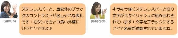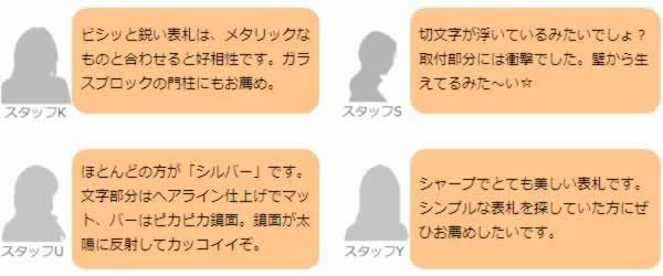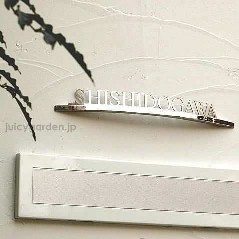 モダンデザイン表札このシリーズならではの「サイン文字」が美しい!!他のステンレス表札と違い、最終仕上げでクリア塗装を施すのが大きな特徴です。これはステンレスを保護するとともに、文字の色落ちも出来るだけ防ぐため。表には見えない技術にこだわる表札から選んでみては?